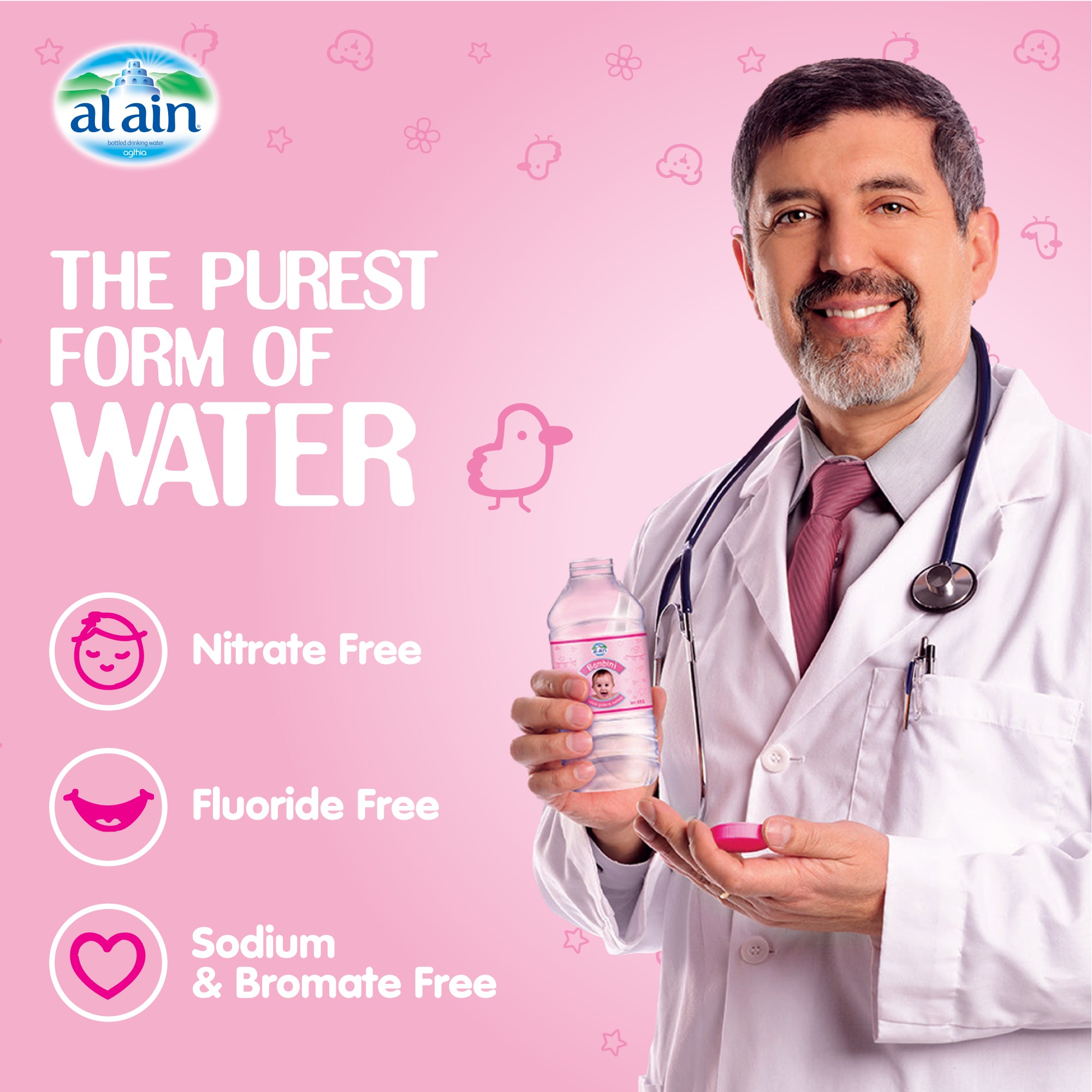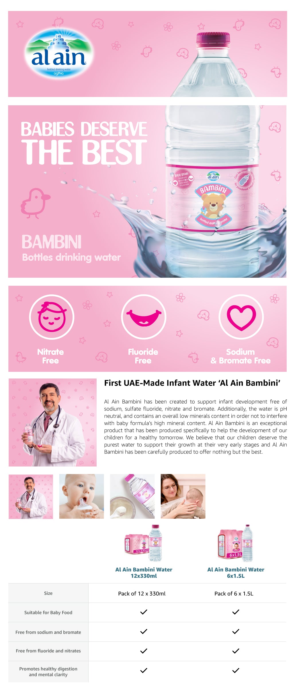BABIES DESERVE THE BEST: Al Ain Bambini Water contributes to your baby's overall well-being. Babies deserve the best, so by ditching sugary drinks and opting for Al Ain Water, it will help their digestion and growth and enhance their mental clarity.