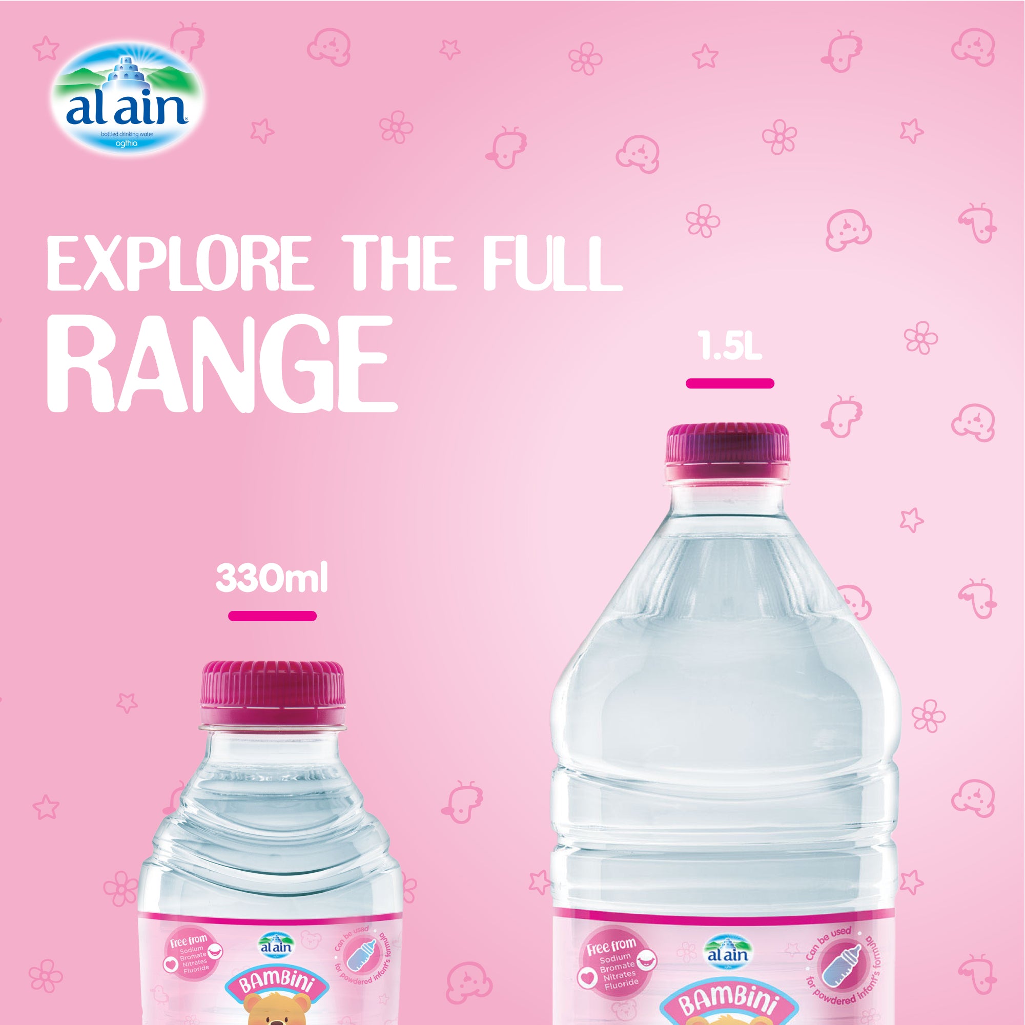SUITABLE FOR MAKING BABY FOOD: Al Ain Bambini water is perfect for preparing baby milk, transitional milk, soluble baby foods, and mixing with juices. Safe and convenient, it’s the ideal water choice for your baby.