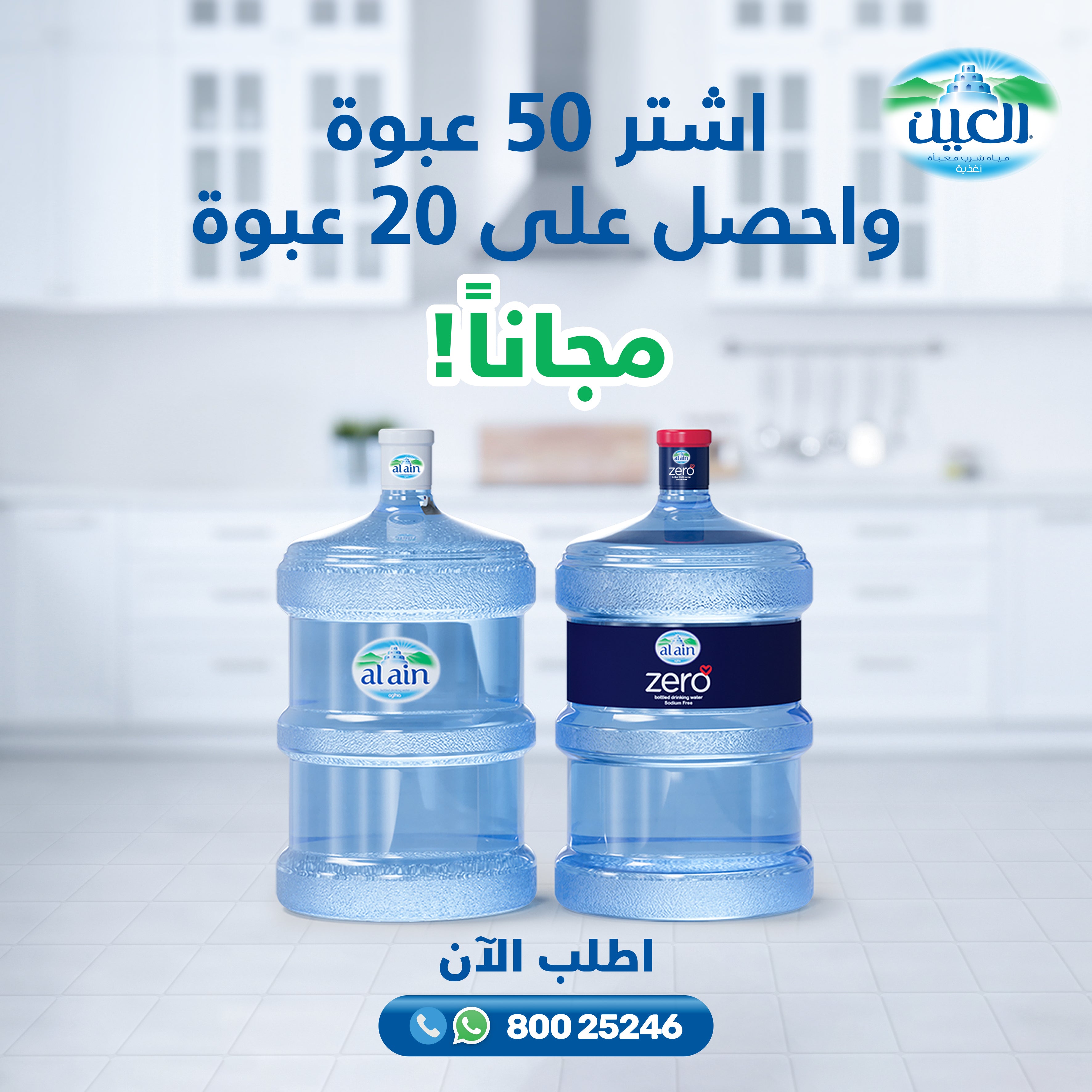 Join now for Al Ain Water 50 + 20 Bottles Free! Get 50 five-gallon bottles and 20 more at no cost, starting from AED 525! -Exclusive Offer for New Customers