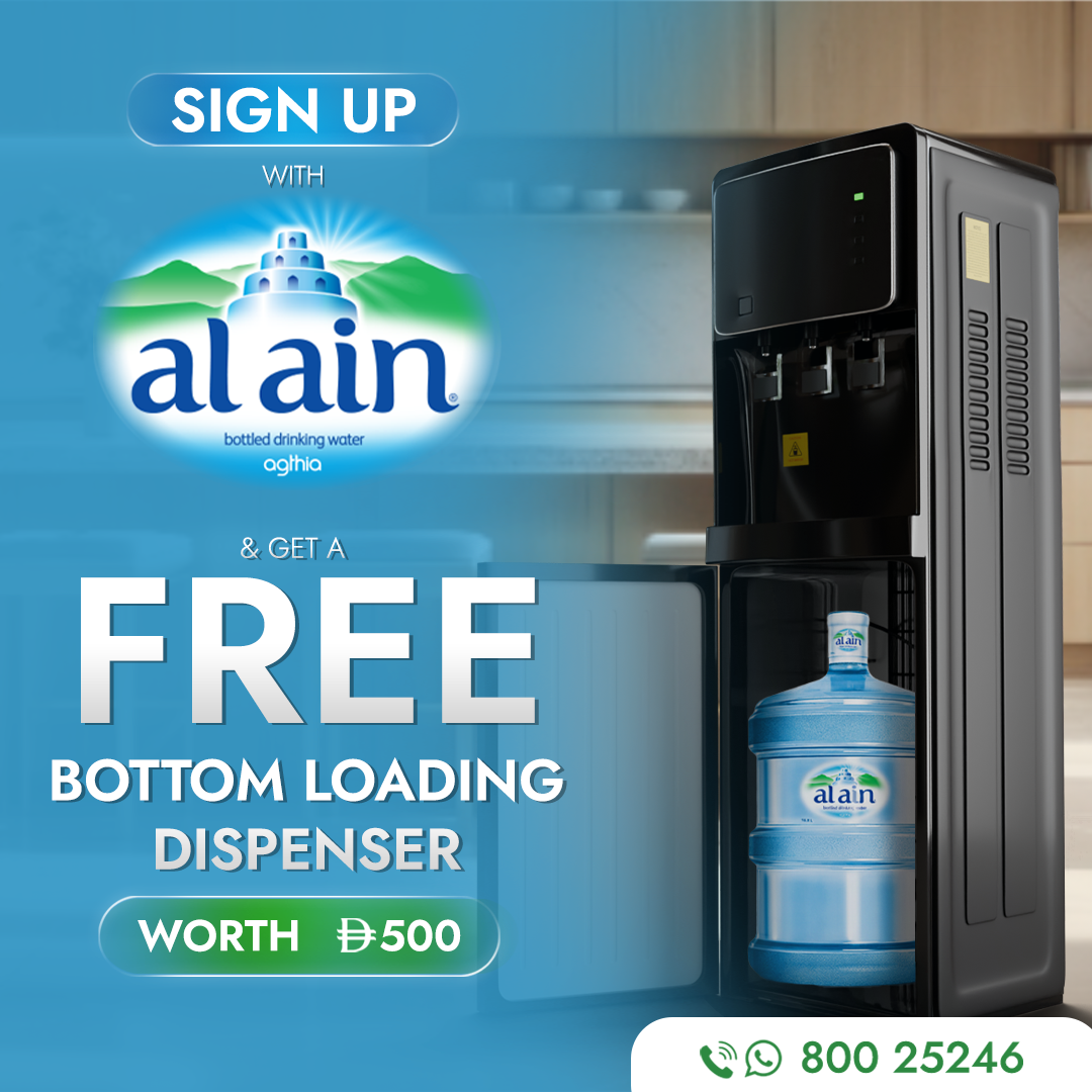 Sign up with Al Ain Water for AED 1300 + VAT and get a free bottom loading dispenser at no extra cost.